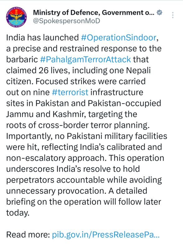 NewDelhi, 07 May 2025: The Indian Armed Forces launched ‘OPERATION SINDOOR’, hitting terrorist infrastructure in Pakistan and Pakistan-occupied Jammu and Kashmir from where terrorist attacks against India have been planned and directed.