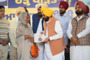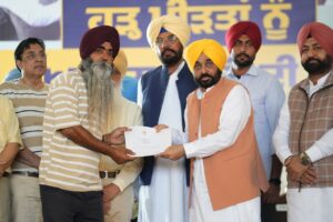(Rajinder Kumar) Ajnala (Amritsar), 13 October 2025: Setting a new benchmark of public service delivery, Punjab Chief Minister Bhagwant Singh Mann on Monday handed over cheques worth Rs 5.70 crore of compensation to 631 beneficiaries within 30 days, despite a deadline of 45 days, after the floods had caused havoc in the district.
