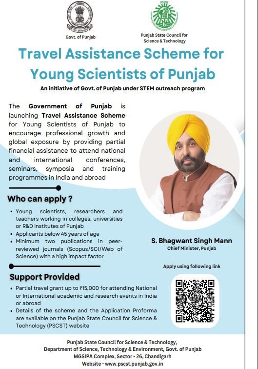 Under the scheme, participants will be provided with Travel Assistance of up to ₹15,000, covering 50 percent of the airfare or maintenance allowance, along with registration fees. This support will grant young scientists the opportunity to familiarize themselves with the latest scientific developments and technological trends worldwide, exchange knowledge, and establish international collaborations. This step will foster research aligned with Punjab’s scientific and technological priorities.