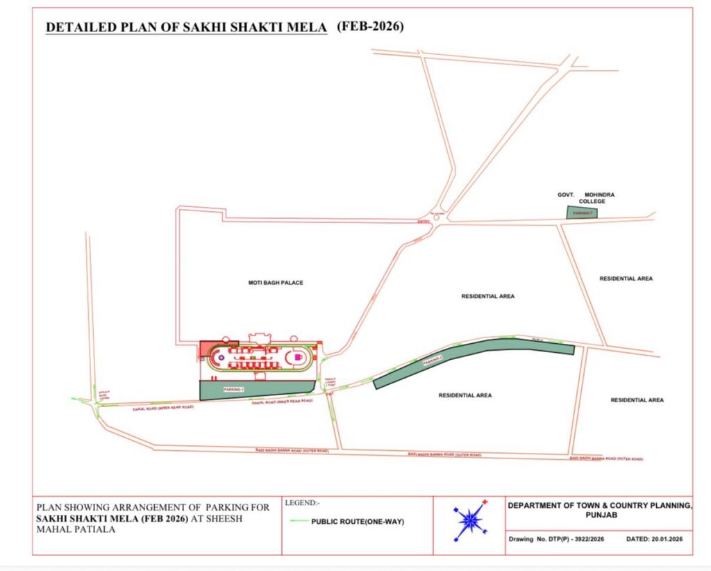 ਸ਼ੀਸ਼ ਮਹਲ ਵਿੱਚ 21 ਫਰਵਰੀ ਤੋਂ 2 ਮਾਰਚ 2026 ਤੱਕ ਲੱਗ ਰਹੇ ਪੰਜਾਬ ਸਖੀ ਸ਼ਕਤੀ ਕਰਾਫ਼ਟ ਮੇਲੇ ਦੌਰਾਨ ਵੱਡੀ ਭੀੜ ਨੂੰ ਧਿਆਨ ਵਿੱਚ ਰੱਖਦਿਆਂ ਟ੍ਰੈਫ਼ਿਕ ਪੁਲਿਸ ਪਟਿਆਲਾ ਵੱਲੋਂ ਤਿੰਨ ਪਾਰਕਿੰਗ ਸਥਾਨ ਨਿਰਧਾਰਤ ਕੀਤੇ ਗਏ ਹਨ। ਇਨ੍ਹਾਂ ਵਿੱਚ ਪਾਰਕਿੰਗ 1: ਡਾਕਲਾ ਚੁੰਗੀ ਟੀ-ਪੁਆਇੰਟ, ਸ਼ੀਸ਼ ਮਹਲ ਦੇ ਪਿੱਛੇ, ਪਾਰਕਿੰਗ 2: ਸੰਜੇ ਕਾਲੋਨੀ ਰੋਡ, ਮਹਿੰਦਰਾ ਕਾਲਜ ਦੇ ਸਾਹਮਣੇ ਅਤੇ ਪਾਰਕਿੰਗ 3: ਸਰਕਾਰੀ ਮਹਿੰਦਰਾ ਕਾਲਜ ਪਾਰਕਿੰਗ ਖੇਤਰ ਸ਼ਾਮਲ ਹਨ।